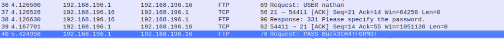 I quickly scanned through the information there and was able to see nathan logging into the ftp client, and since this was not secure I could read the plaintext of his password!!