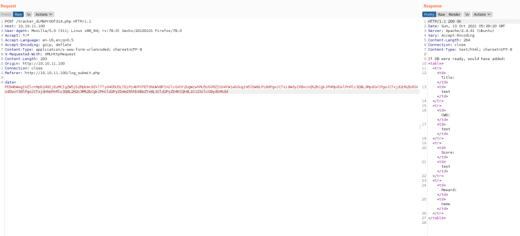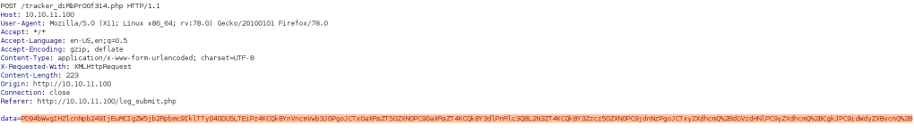 So I notice a couple things. One is that it’s posting from a hidden directory of /tracker_biRbPr00f314.php and the other is that the data has been encoded. Fortunately Burp can show me this 2 stage process on the Inspector pane: