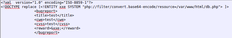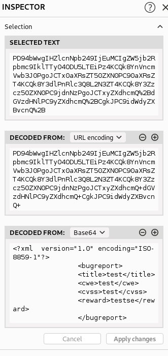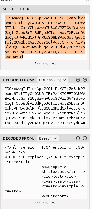 In the bottom pane I see the full decoded info, and XXE, so I know it can parse the XML data. Now I want to see if it can read the XML data if I try to give it a new payload. There are several ways this could be done but I amended the xml like so: