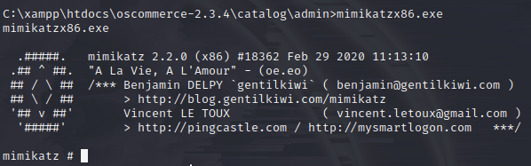 In order to get that last bit of info (and information that would be good to have if actually exploiting the machine in a real environment), I went ahead and uploaded mimikatz in the same way as the previous files (making sure to use the x86 version) and then ran it: