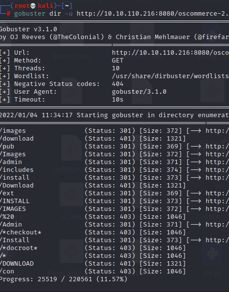The catalog itself led to a messed up default page for this oscommerce app, so with the previously running gobuster scans returning nothing, I enumerating further down the tree to see if there was something useful here or not: