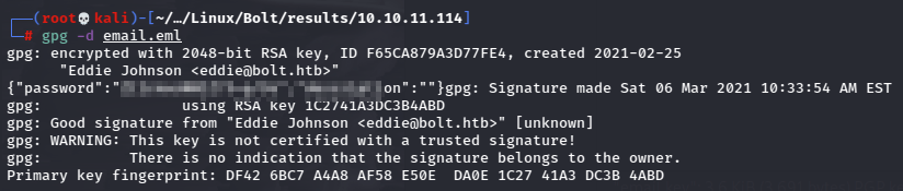Once down far enough, there is a log file which contains Eddie’s private PGP key.