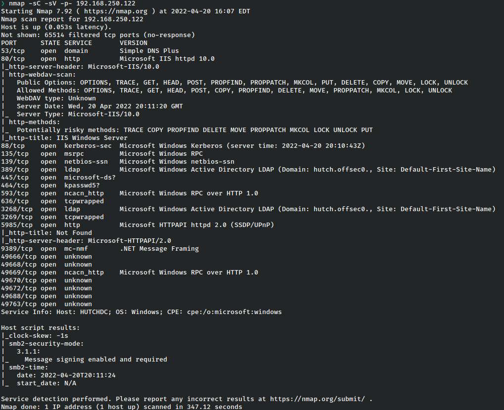 It’s immediately apparent that this is a domain controller based on the services. We have IIS running a web server at port 80, Kerberos running on port 88, and LDAP at port 389.