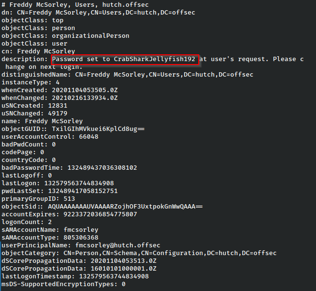 Most excellent. We’ve successfully dumped the users from LDAP. We think about sorting through this list to perform a password spray attack, but scrolling through the data, we eventually notice an unusual description.