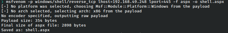 From here the clearest path forward is to unload a reverse shell, which can be done via a msfvenom payload such as this.