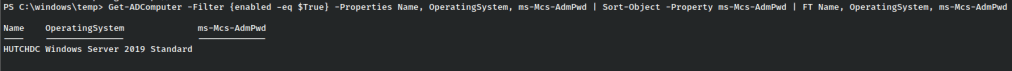 Get-ADComputer -Filter {enabled -eq $True} -Properties Name, OperatingSystem, ms-Mcs-AdmPwd | Sort-Object -Property ms-Mcs-AdmPwd | FT Name, OperatingSystem, ms-Mcs-AdmPwd