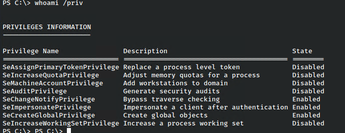 In this case, we were presented with a number of options, but the juiciest privilege of all is SeImpersonate. This allows a user to run in the context of another, and there have been several exploits around to abuse this for quite some time.