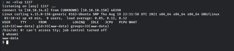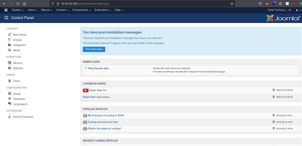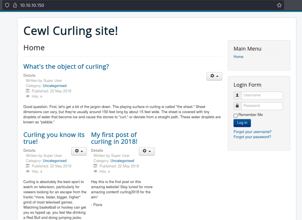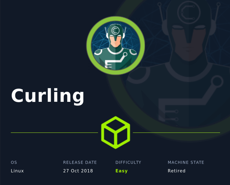 Curling is an easy machine that required directory busting a web page to find a secret key to access a Joomla CMS admin panel. This allowed for code execution which led to our initial shell. From there we moved laterally by finding a hex dump, decoding it, and discovering a password. To achieve root access, we exploited a misconfiguration where a running cronjob where curl was calling a file we had write access to, allowing for code execution as root.