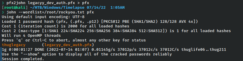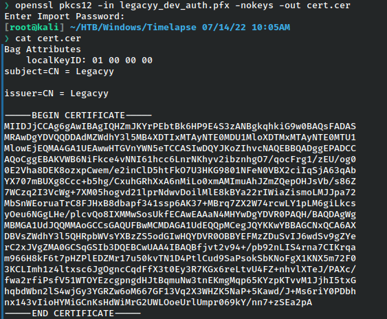 It cracks very quickly and we can access the file. However the pfx is also password protected, so using the pfx2john we will perform the same action as before to crack that.