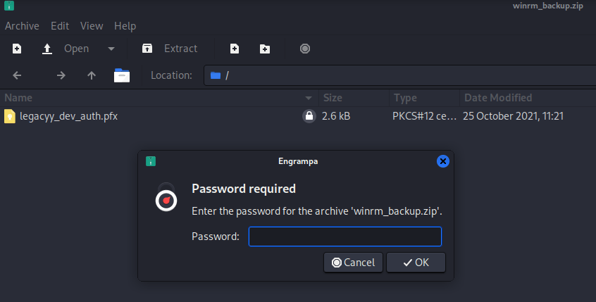 Pfx files store public and private keys that can be used for verification in several use cases, but since we got this from a backup that was labeled as winrm, it’s a smart assumption that in this case we might be able to use it to login.
