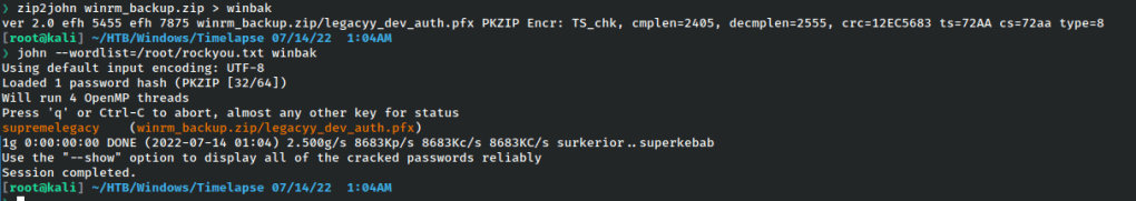 It’s got a certificate inside but the zip is password protected. Let’s use John to crack it.