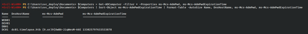 $Computers | Sort-Object ms-Mcs-AdmPwdExpirationTime | Format-Table -AutoSize Name, DnsHostName, ms-Mcs-AdmPwd, ms-Mcs-AdmPwdExpirationTime