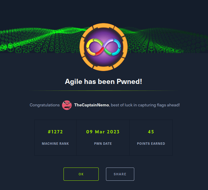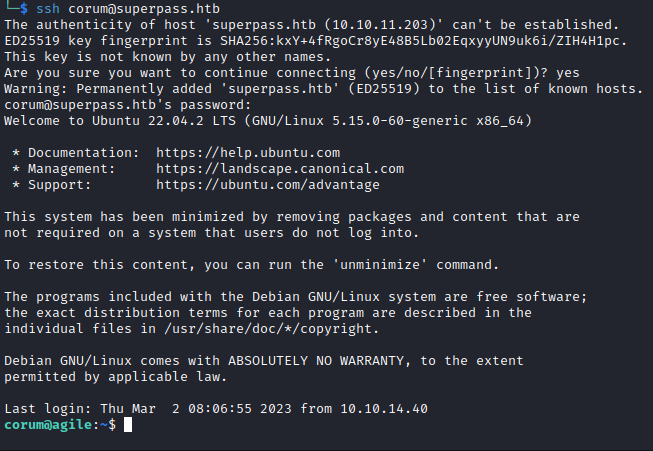 Excellent! If we recall from earlier, corum is a user on the machine. There’s a good likelihood this agile password could be the ssh password for that user, so let’s go ahead and try it.