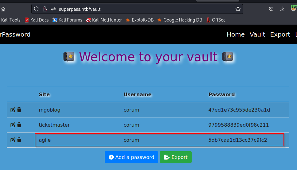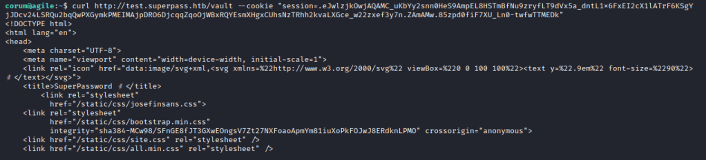 Look familiar? That’s right, it’s the cookie to access the vault, but this one being the test subdomain which is only accessable internally. Let’s do another curl request to test.superpass with the cookies added.