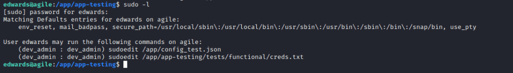 It seems that edwards may run sudoedit as dev_admin on two particular files. After doing so, I noted these files aren’t particularly interesting as they are only related to the web app and mysql, which don’t help us as no higher privileged users are accessing or otherwise using those services.
