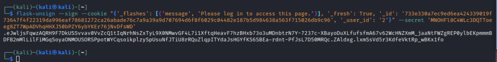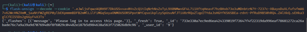 Here we see the app.py file holds the SECRET_KEY which is the key that Flask uses to sign session tokens. Using this key, we can sign our own key, but first we need to have a look at our own key to see what we need to change. This can be done using flask-unsign with the –decode flag and passing the session cookie.