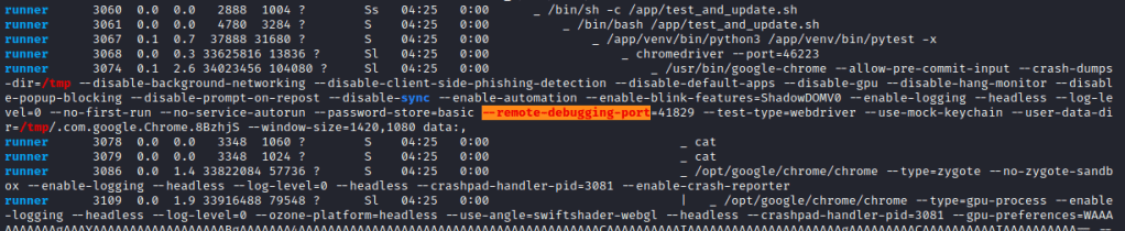 This process represents another user running chrome and the ensuing flags. Highlighted is the important part, an open remote-debugging port on the machine. According to this excellent blog on the subject, the debugging port on Chrome gives access to dev tools, which can potentially lead to leaked cookies.