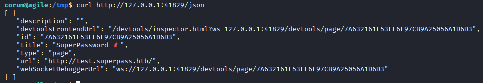 According to the blog, the /json endpoint on chrome’s debug port should return some userful information that will let us know if we can proceed with this attack method, so I went ahead and hit it with a curl request.